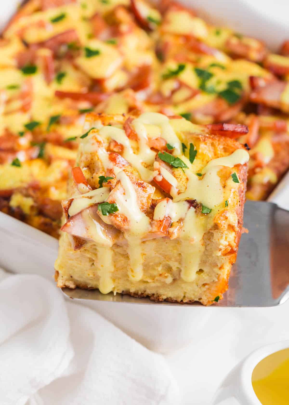 Eggs Benedict CasseroleEnglish muffin cubes and Canadian bacon pieces are held together in this eggs benedict casserole by a seasoned egg mixture and finished with a rich, velvety hollandaise sauce!